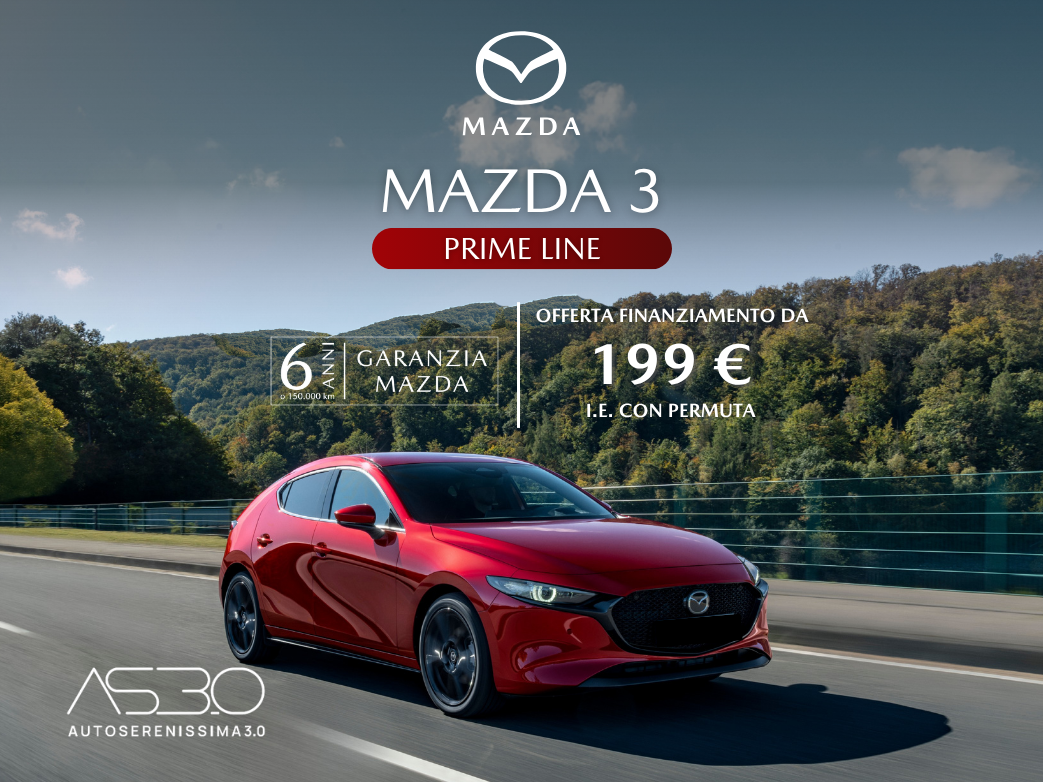 * Vantaggi Mazda in caso di permuta e solo con finanziamento Mazda Advantage fino al 30/06/2026: vantaggio fino a 3.550€ presso i concessionari Mazda aderenti all’iniziativa. *** salvo condizioni e limitazioni indicate da contratto; chilometraggio annuale 15.000 km; eccedenza chilometrica € 0,10 per km. ** Annuncio promozionale. MAZDA3 PRIME LINE 2WD 140CV 6MT Prezzo di listino €28.350; Esempio di finanziamento. Offerta valida solo con finanziamento Mazda Advantage e in caso di permuta: Prezzo promo € 24.800,00, anticipo € 7.600,00; importo totale del credito € 17.200,00, da restituire in 36 rate mensili ognuna di € 198,21, ed un VFG pari alla maxi rata finale di € 13.324,50, importo totale dovuto dal consumatore € 20.675,55. TAN 5,99% (tasso fisso) – TAEG 7,63% (tasso fisso). Spese comprese nel costo totale del credito: interessi € 2.861,06, istruttoria € 399,00, incasso rata € 4,50 cad. a mezzoSDD, produzione e invio lettera conferma contratto € 1.00; comunicazione periodica annuale € 1,00 cad.; imposta sostitutiva (o imposta di bollo): € 43,99. Offerta valida presso i dealers aderenti, fino al 30/06/2026. Condizioni contrattuali ed economiche in “Informazioni Europee di Base sul Credito ai Consumatori” presso la rete di vendita e sul sito www.santanderconsumer.it, sez. Trasparenza. Salvo approvazione di Santander Consumer Bank.