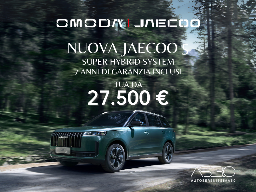 Es. di finanziamento su Jaecoo 5 ICE PURE – Prezzo Listino (messa su strada, IPT e contributo PFU esc.) 26.810€. Prezzo Promo 24.500€, in caso di permuta o rottamazione di un veicolo usato ed esclusivamente per dealer aderenti all’iniziativa. Anticipo 5.570 €, durata 36 mesi, 35 rate mensili di 179€ (incluse spese incasso di 4,50€/rata). Maxi Rata 16.342 €. Importo Totale del Credito 19.271€ (spese istruttoria 325€, bollo 16€). Spese invio rendiconto periodico digitale: 2€/anno. Interessi totali 3.179€. Importo Totale Dovuto (escluso anticipo) 22.954€. TAN fisso 5,95% – TAEG 7,19%. Offerta CA AUTO BANK soggetta ad approvazione. Documentazione precontrattuale e assicurativa in Concessionaria e sul sito CA AUTO BANK (sez. Trasparenza). Messaggio pubblicitario con finalità promozionale. Iniziativa valida fino al 31.10.2025.