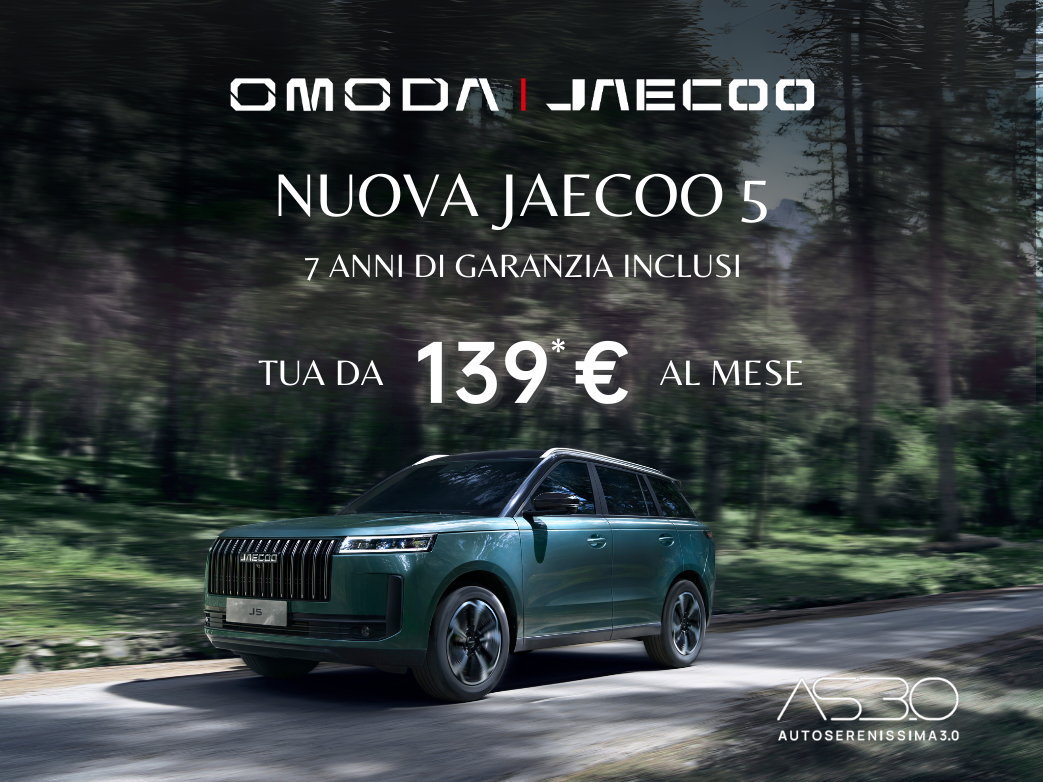 Es. di finanziamento su Jaecoo 5 ICE PURE – Prezzo Listino (messa su strada, IPT e contributo PFU esc.) 26.810€. Prezzo Promo 22.950€, in caso di permuta o rottamazione di un veicolo usato ed esclusivamente per dealer aderenti all’iniziativa. Anticipo 5.300 €, durata 36 mesi, 35 rate mensili di 139€ (incluse spese incasso di 4,50€/rata). Maxi Rata 16.354 €. Importo Totale del Credito 17.991€ (spese istruttoria 325€, bollo 16€). Spese invio rendiconto periodico digitale: 2€/anno. Interessi totali 3.062€. Importo Totale Dovuto (escluso anticipo) 21.557€. TAN fisso 5,95% – TAEG 7,24%. Offerta CA AUTO BANK soggetta ad approvazione. Documentazione precontrattuale e assicurativa in Concessionaria e sul sito CA AUTO BANK (sez. Trasparenza). Messaggio pubblicitario con finalità promozionale. Iniziativa valida fino al 31.01.2026.