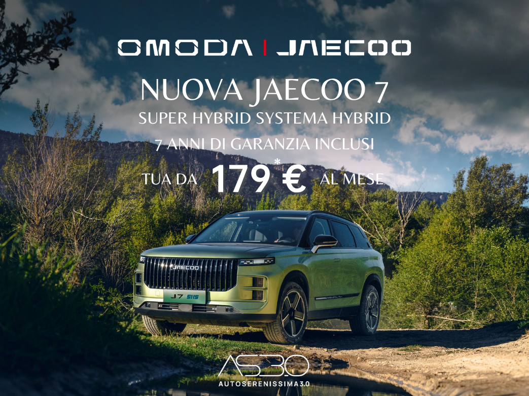 Es. di finanziamento su Jaecoo 7 SHS-H Pure – Prezzo Listino (messa su strada esc. IPT e contributo PFU esc.) 33.210€. Prezzo Promo 26.900€, solo in caso di rottamazione di un veicolo usato ed esclusivamente per dealer aderenti all’iniziativa. Anticipo 6.820 €, durata 36 mesi, 35 rate mensili di 179€ (escluse spese incasso di 5,95€/rata). Maxi Rata 18.598€. Importo Totale del Credito 20.571€, (spese istruttoria 475€, bollo 16€). Spese invio rendiconto periodico digitale: 2€/anno. Interessi totali 4.079 €. Importo Totale Dovuto (escluso anticipo) 24.655€. TAN fisso 6,95% – TAEG 8,49%. Offerta CA AUTO BANK soggetta ad approvazione. Documentazione precontrattuale e assicurativa in Concessionaria e sul sito CA AUTO BANK (sez. Trasparenza). Messaggio pubblicitario con finalità promozionale. Iniziativa valida fino al 30.04.2026.