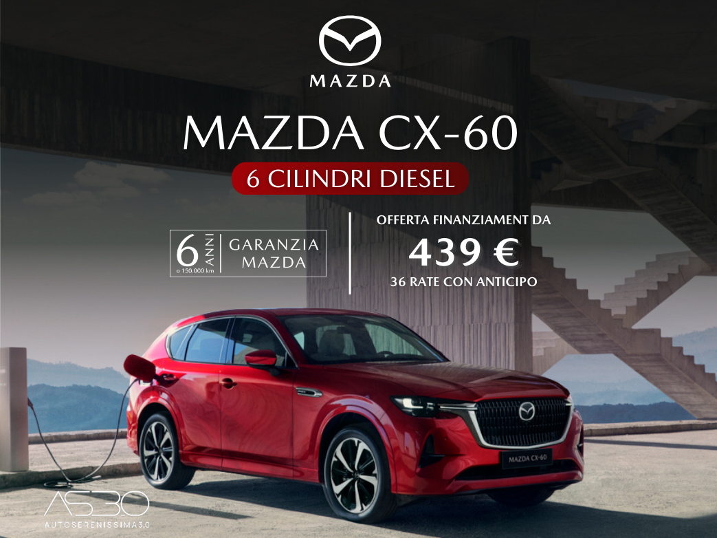 * In caso di finanziamento Mazda Advantage e in caso di permuta: vantaggio di 6.000€ grazie agli Incentivi Mazda valido fino al 08/01/2026 presso i concessionari aderenti all’iniziativa. ***MAZDA ADVANTAGE: salvo condizioni e limitazioni indicate da contratto; chilometraggio annuale 20.000 km; eccedenza chilometrica €0,10 per km. **Annuncio promozionale. MAZDA CX-60 3,3L E-SKYACTIV D 200 CV RWD PRIME LINE Prezzo di listino €53.850,00. Esempio di finanziamento. Offerta valida solo con finanziamento Mazda Advantage e in caso di permuta: Prezzo promozionale €47.850,00, anticipo €10.530,00; importo totale del credito €37.320,00, da restituire in 36 rate mensili ognuna di €438,88, ed un VFG pari alla maxi rata finale di €28.002,00, importo totale dovuto dal consumatore €44.067,47. TAN 5,99% (tasso fisso) – TAEG 6,90% (tasso fisso). Spese comprese nel costo totale del credito: interessi € 6.082,68, istruttoria €399,00, incasso rata €4,50 cad. a mezzoSDD, produzione e invio lettera conferma contratto €1.00; comunicazione periodica annuale €1,00 cad.; imposta sostitutiva (o imposta di bollo): €94,29. Offerta valida presso i dealers aderenti, fino al 08/01/2026. Condizioni contrattuali ed economiche in “Informazioni Europee di Base sul Credito ai Consumatori” presso la rete di vendita e sul sito www.santanderconsumer.it, sez. Trasparenza. Salvo approvazione di Santander Consumer Bank.