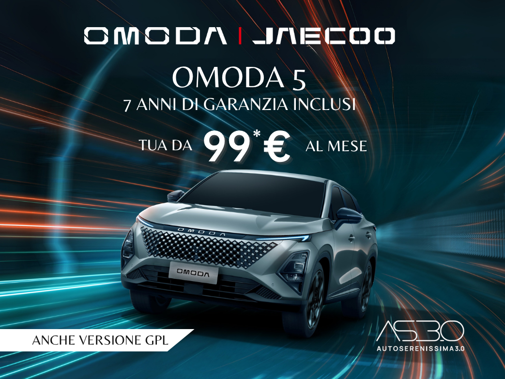 OMODA 5 PURE. Anticipo 7.909 € – 35 rate mensili di 99 € – Maxi Rata 14.991€ TAN fisso 6,95% – TAEG 8,47%. Fino al 30.09.2025.Es. di finanziamento su Omoda 5 Pure – Prezzo Listino (messa su strada esc. IPT econtributo PFU esc.)26.300€. Prezzo Promo 22.900€, in caso di permuta o rottamazione di un veicolo usato.Anticipo 7.909 €,durata 36 mesi,35 rate mensilidi 99€(escluse spese incasso di 4,50€/rata).Maxi Rata 14.991€. Importo Totaledel Credito 15.332€, (spese istruttoria 325€, bollo 16€). Spese invio rendicontoperiodico digitale: 2€/anno. Interessi totali 3.154 €. Importo Totale Dovuto (escluso anticipo) 18.990€. TAN fisso 6,95% – TAEG 8,47%.Offerta CA AUTO BANK soggetta ad approvazione.Documentazione precontrattuale e assicurativa in Concessionaria e sul sito CA AUTOBANK (sez. Trasparenza). Messaggio pubblicitario con finalità promozionale. Iniziativavalida fino al 30.10.2025