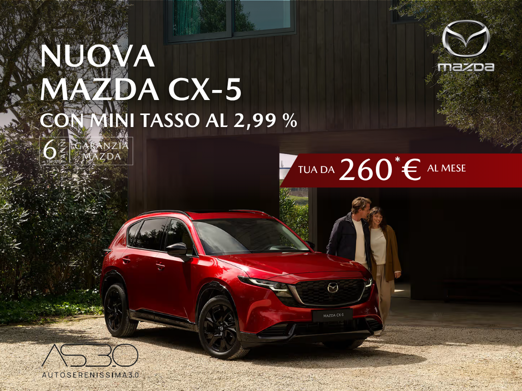 4 MAZDA ADVANTAGE: salvo condizioni e limitazioni indicate da contratto; chilometraggio annuale 15.000 km; eccedenza chilometrica € 0,10 per km. 3 Annuncio promozionale. MAZDA CX-5 141 CV 2WD 6AT PRIME LINE Prezzo di listino €35.900. Prezzo promo in caso di permuta €31.400, anticipo €5.210; importo totale del credito €26.190, da restituire in 36 rate mensili ognuna di €259,02, ed un VFG pari alla maxi rata finale di €19.386,00, importo totale dovuto dal consumatore €28.948,69. TAN 2,99% (tasso fisso) – TAEG 4,00% (tasso fisso). Spese comprese nel costo totale del credito: interessi €2.121,72, istruttoria €399,00, incasso rata €4,50 cad. a mezzoSDD, produzione e invio lettera conferma contratto €1.00; comunicazione periodica annuale €1,00 cad.; imposta sostitutiva (o imposta di bollo): €66,47. Offerta valida presso i dealers aderenti, fino al 31/12/2025. Condizioni contrattuali ed economiche in “Informazioni Europee di Base sul Credito ai Consumatori” presso la rete di vendita e sul sito www.santanderconsumer.it, sez. Trasparenza. Salvo approvazione di Santander Consumer Bank.