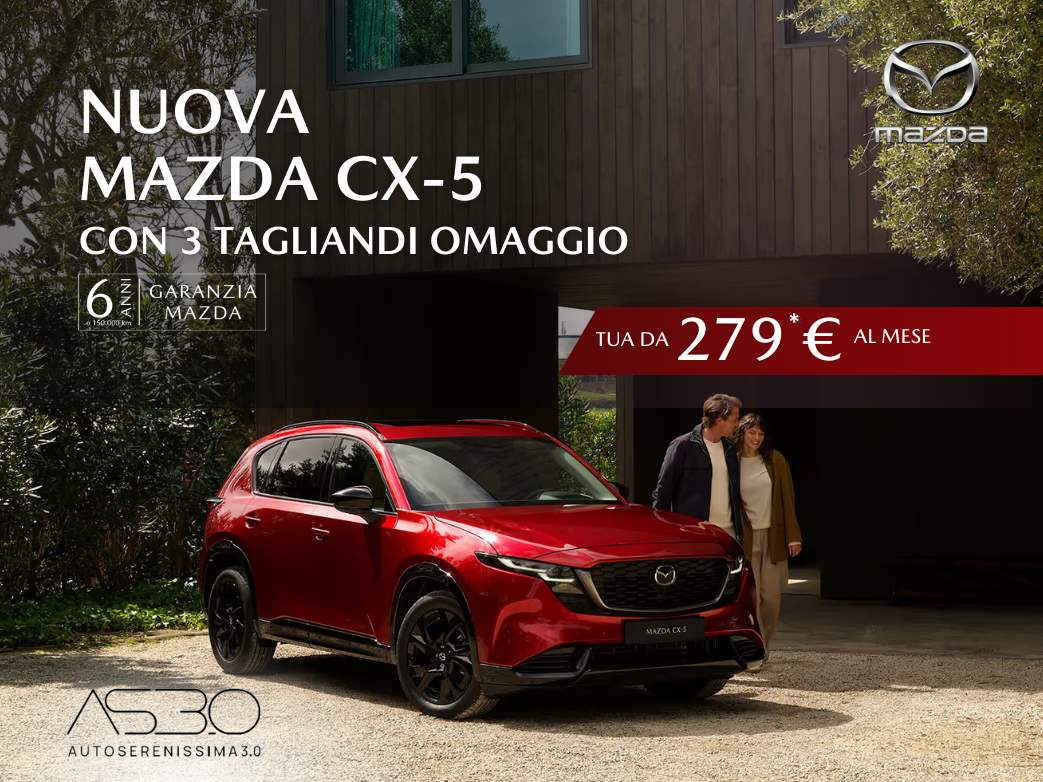 4 MAZDA ADVANTAGE: salvo condizioni e limitazioni indicate da contratto; chilometraggio annuale 15.000 km; eccedenza chilometrica € 0,10 per km. 3 Annuncio pubblicitario con finalità promozionale. Esempio di finanziamento: MAZDA CX-5 2.5 mhev Prime-Line 2wd 141cv Prezzo di listino € 35.900,00. Prezzo promo € 31.400,00, anticipo € 4.950,00; importo totale del credito € 26.450,00, da restituire in 36 rate mensili ognuna di € 278,64, ed un VFG pari alla maxi-rata finale di € 20.463,00, importo totale dovuto dal consumatore € 30.732,66. TAN 4,99% (tasso fisso) – TAEG 6,08% (tasso fisso). Spese comprese nel costo totale del credito: interessi € 3.645,04, istruttoria € 399,00, incasso rata € 4,50 cad. a mezzoSDD, produzione e invio lettera conferma contratto € 1.00; comunicazione periodica annuale € 1,00 cad.; imposta sostitutiva (o imposta di bollo): € 67,12. Offerta valida presso i dealers aderenti, fino al 31/03/2026. Condizioni contrattuali ed economiche in “Informazioni Europee di Base sul Credito ai Consumatori” presso la rete di vendita e sul sito www.santanderconsumer.it, sez. Trasparenza. Salvo approvazione di Santander Consumer Bank. I 3 anni sono calcolati considerando una percorrenza massima di 20.000 km l’anno; fanno riferimento esclusivamente al tagliando di manutenzione ordinaria da eseguirsi ogni 20.000km o ogni 12 mesi quale dei due eventi si verifichi per primo, come prescritto dal Costruttore.