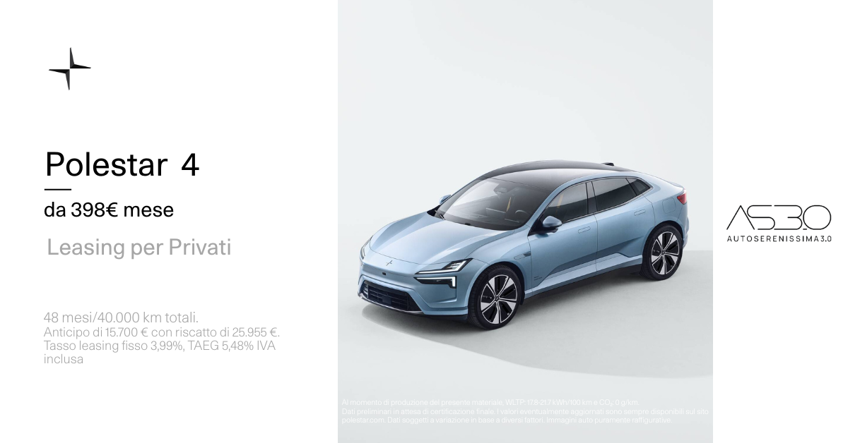 Importo massimo concedibile. Incentivi di 7.000 € validi per tutte le versioni di Polestar 4 preconfigurate e da configurare, in caso di pagamento in unica soluzione. Promozione valida per clienti Partita IVA e Privati, per ordini effettuati entro il 30.06.2025. Tutti gli importi si intendono IVA inclusa (secondo l’aliquota vigente). I prezzi sono già comprensivi degli incentivi Polestar.