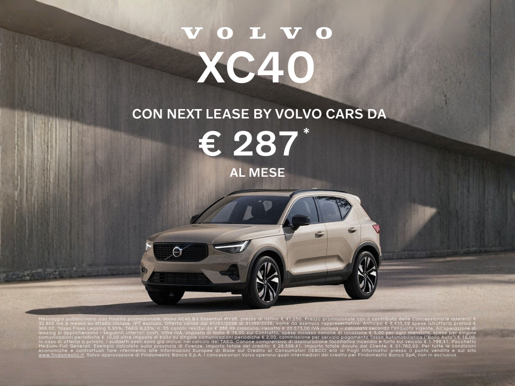 a. *Messaggio pubblicitario con finalità promozionale. Volvo XC40 B3 Essential MY26, prezzo di listino € 41.250. Prezzo promozionale con il contributo delle Concessionarie aderenti € 32.800 Iva e messa su strada incluse, IPT esclusa. Offerta valida dal 13/09/2025 al 31/12/2025, come da esempio rappresentativo: Anticipo € 7.950,49 spese istruttoria pratica € 366,00, Tasso Fisso Leasing 3,95%, TAEG 7,03%, n. 35 canoni residui da € 259,92 ciascuno, riscatto € 20.660,00 IVA inclusa – calcolata secondo l’aliquota vigente. All’operazione di leasing si applicheranno i seguenti ulteriori costi, oltre IVA, imposta di bollo € 16,00 sul Contratto, spese incasso canone di locazione € 5,00 per ogni mensilità, spese per singole comunicazioni periodiche € 10,00 oltre imposta di bollo su singole comunicazioni periodiche € 2,00, commissione per servizio pagamento Tassa Automobilistica (“Bollo Auto”) € 10,00. In caso di offerta a privato, i suddetti costi sono già inclusi nel calcolo del TAEG. Canone comprensivo di assicurazione facoltativa incendio e furto sul veicolo € 1.799,41. Pacchetto Medium-Full Generali. Esempio calcolato sulla provincia di Firenze. Importo totale del credito: € 27.084,41. Importo totale dovuto dal Cliente: € 30.919,08. Per tutte le condizioni economiche e contrattuali fare riferimento alle Informazioni Europee di Base sul Credito ai Consumatori (IEBCC) e/o ai Fogli Informativi presso il punto vendita e sul sito www.findomestic.it. Salvo approvazione di Findomestic Banca S.p.A. I concessionari Volvo operano quali intermediari del credito per Findomestic Banca SpA, non in esclusiva.