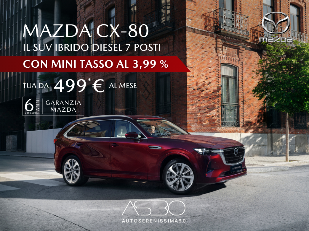 Incentivi Mazda in caso di permuta solo con finanziamento Mazda Advantage: vantaggio fino a 6.250€ presso i concessionari Mazda aderenti all’iniziativa. Offerta valida fino al 31/10/2025. salvo condizioni e limitazioni indicate da contratto; chilometraggio annuale 20.000 km; eccedenza chilometrica € 0,10 per km. Annuncio promozionale. Mazda CX-80 249 CV AWD AT Exclusive Line Prezzo di listino €63.800,00. Prezzo promo €57.550,00, anticipo €12.360,00; importo totale del credito €45.190,00, da restituire in 36 rate mensili ognuna di €498,94, ed un VFG pari alla maxi rata finale di €35.090,00, importo totale dovuto dal consumatore €53.337,31. TAN 5,99% (tasso fisso) – TAEG 6,78% (tasso fisso). Spese comprese nel costo totale del credito: interessi € 7.462,84, istruttoria €399,00, incasso rata €4,50 cad. a mezzoSDD, produzione e invio lettera conferma contratto €1.00; comunicazione periodica annuale €1,00 cad.; imposta sostitutiva (o imposta di bollo): €113,97. Offerta valida presso i dealers aderenti, fino al 31/10/2025. Condizioni contrattuali ed economiche in “Informazioni Europee di Base sul Credito ai Consumatori” presso la rete di vendita e sul sito www.santanderconsumer.it, sez. Trasparenza. Salvo approvazione di Santander Consumer Bank.​