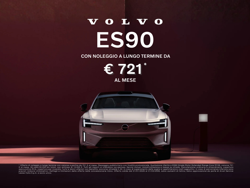 * Offerta di noleggio a lungo termine con canone a partire da 721 € al mese. Messaggio pubblicitario con finalità promozionale. Quotazione riferita a ES90 Single Motor Extended Range Core MY26, canone 721 € al mese, 36 mesi/30.000 km totali, con anticipo di 10.000 €. Tutti gli importi si intendono iva esclusa. Servizi inclusi: immatricolazione e messa su strada, manutenzione ordinaria e straordinaria, copertura assicurativa RCA, copertura per incendio, furto e danni ulteriori con penalità, soccorso stradale h 24. In caso di superamento della soglia si applicheranno costi aggiuntivi. In caso di percorrenza inferiore sono previsti rimborsi chilometrici. Dettagli e limitazioni della offerta nelle concessionarie Volvo. Offerta valida dal 01/01/2026 al 31/03/2026, salvo aumenti di listino, salvo approvazione da parte di Arval Service Lease Italia S.p.A. a socio unico.