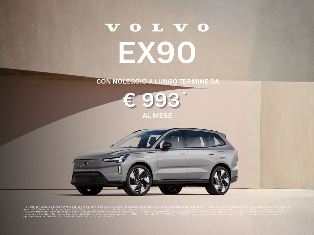 * Offerta di noleggio a lungo termine con canone a partire da 993 € al mese. Messaggio pubblicitario con finalità promozionale. Quotazione riferita a EX90 Single Motor Plus MY26, canone 993 € al mese, 36 mesi / 30.000 km totali, con anticipo di 12.000 €. Tutti gli importi si intendono iva esclusa. Servizi inclusi: immatricolazione e messa su strada, manutenzione ordinaria e straordinaria, copertura assicurativa RCA, copertura per incendio, furto e danni ulteriori con penalità, soccorso stradale h 24. In caso di superamento della soglia si applicheranno costi aggiuntivi. In caso di percorrenza inferiore sono previsti rimborsi chilometrici. Dettagli e limitazioni dell’offerta nelle concessionarie Volvo. Offerta valida dal 01/01/2026 al 31/03/2026 presso i concessionari aderenti all’iniziativa, salvo aumenti di listino, salvo approvazione da parte di Arval Service Lease Italia S.p.A. a socio unico.