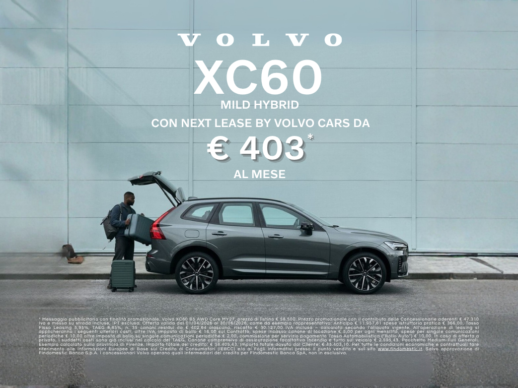 * Messaggio pubblicitario con finalità promozionale. Volvo XC60 B5 AWD Core MY27, prezzo di listino € 58.500. Prezzo promozionale con il contributo delle Concessionarie aderenti € 47.310 Iva e messa su strada incluse, IPT esclusa. Offerta valida dal 01/04/2026 al 30/06/2026, come da esempio rappresentativo: Anticipo € 11.957,61 spese istruttoria pratica € 366,00, Tasso Fisso Leasing 5,95%, TAEG 8,85%, n. 35 canoni residui da € 402,64 ciascuno, riscatto € 30.127,00 IVA inclusa – calcolata secondo l’aliquota vigente. All’operazione di leasing si applicheranno i seguenti ulteriori costi, oltre IVA, imposta di bollo € 16,00 sul Contratto, spese incasso canone di locazione € 5,00 per ogni mensilità, spese per singole comunicazioni periodiche € 10,00 oltre imposta di bollo su singole comunicazioni periodiche € 2,00, commissione per servizio pagamento Tassa Automobilistica (“Bollo Auto”) € 10,00. In caso di offerta a privato, i suddetti costi sono già inclusi nel calcolo del TAEG. Canone comprensivo di assicurazione facoltativa incendio e furto sul veicolo € 2.595,43. Pacchetto Medium-Full Generali. Esempio calcolato sulla provincia di Firenze. Importo totale del credito: € 38.405,43. Importo totale dovuto dal Cliente: € 45.403,10. Per tutte le condizioni economiche e contrattuali fare riferimento alle Informazioni Europee di Base sul Credito ai Consumatori (IEBCC) e/o ai Fogli Informativi presso il punto vendita e sul sito www.findomestic.it. Salvo approvazione di Findomestic Banca S.p.A. I concessionari Volvo operano quali intermediari del credito per Findomestic Banca SpA, non in esclusiva.