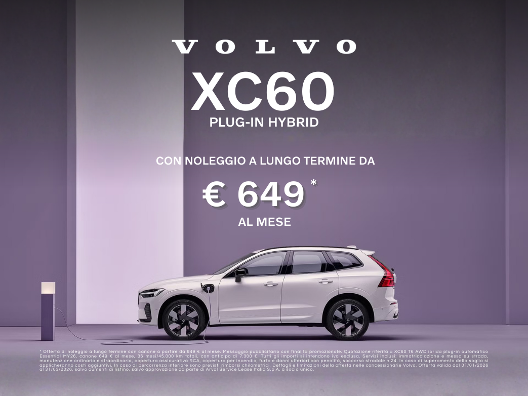 * Offerta di noleggio a lungo termine con canone a partire da 649 € al mese. Messaggio pubblicitario con finalità promozionale. Quotazione riferita a XC60 T6 AWD ibrida plug-in automatico Essential MY26, canone 649 € al mese, 36 mesi/45.000 km totali, con anticipo di 7.300 €. Tutti gli importi si intendono iva esclusa. Servizi inclusi: immatricolazione e messa su strada, manutenzione ordinaria e straordinaria, copertura assicurativa RCA, copertura per incendio, furto e danni ulteriori con penalità, soccorso stradale h 24. In caso di superamento della soglia si applicheranno costi aggiuntivi. In caso di percorrenza inferiore sono previsti rimborsi chilometrici. Dettagli e limitazioni della offerta nelle concessionarie Volvo. Offerta valida dal 01/01/2026 al 31/03/2026, salvo aumenti di listino, salvo approvazione da parte di Arval Service Lease Italia S.p.A. a socio unico.
