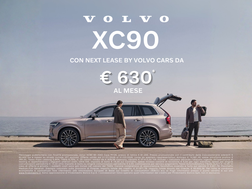 c. *** Messaggio pubblicitario con finalità promozionale. Volvo XC90 B5 AWD Core MY26, prezzo di listino € 81.200. Prezzo promozionale con il contributo delle Concessionarie aderenti € 62.920 Iva e messa su strada incluse, IPT esclusa. Offerta valida dal 01/01/2026 al 31/03/2026, come da esempio rappresentativo: Anticipo € 14.981,40 spese istruttoria pratica € 366,00, Tasso Fisso Leasing 5,95%, TAEG 8,70%, n. 35 canoni residui da € 629,56 ciascuno, riscatto € 37.413,00 IVA inclusa – calcolata secondo l’aliquota vigente. All’operazione di leasing si applicheranno i seguenti ulteriori costi, oltre IVA, imposta di bollo € 16,00 sul Contratto, spese incasso canone di locazione € 5,00 per ogni mensilità, spese per singole comunicazioni periodiche € 10,00 oltre imposta di bollo su singole comunicazioni periodiche € 2,00, commissione per servizio pagamento Tassa Automobilistica (“Bollo Auto”) € 10,00. In caso di offerta a privato, i suddetti costi sono già inclusi nel calcolo del TAEG. Canone comprensivo di assicurazione facoltativa incendio e furto sul veicolo € 3.451,79. Pacchetto Medium-Full Generali. Esempio calcolato sulla provincia di Firenze. Importo totale del credito: € 51.871,78. Importo totale dovuto dal Cliente: € 60.655,36. Per tutte le condizioni economiche e contrattuali fare riferimento alle Informazioni Europee di Base sul Credito ai Consumatori (IEBCC) e/o ai Fogli Informativi presso il punto vendita e sul sito www.findomestic.it. Salvo approvazione di Findomestic Banca S.p.A. I concessionari Volvo operano quali intermediari del credito per Findomestic Banca SpA, non in esclusiva.