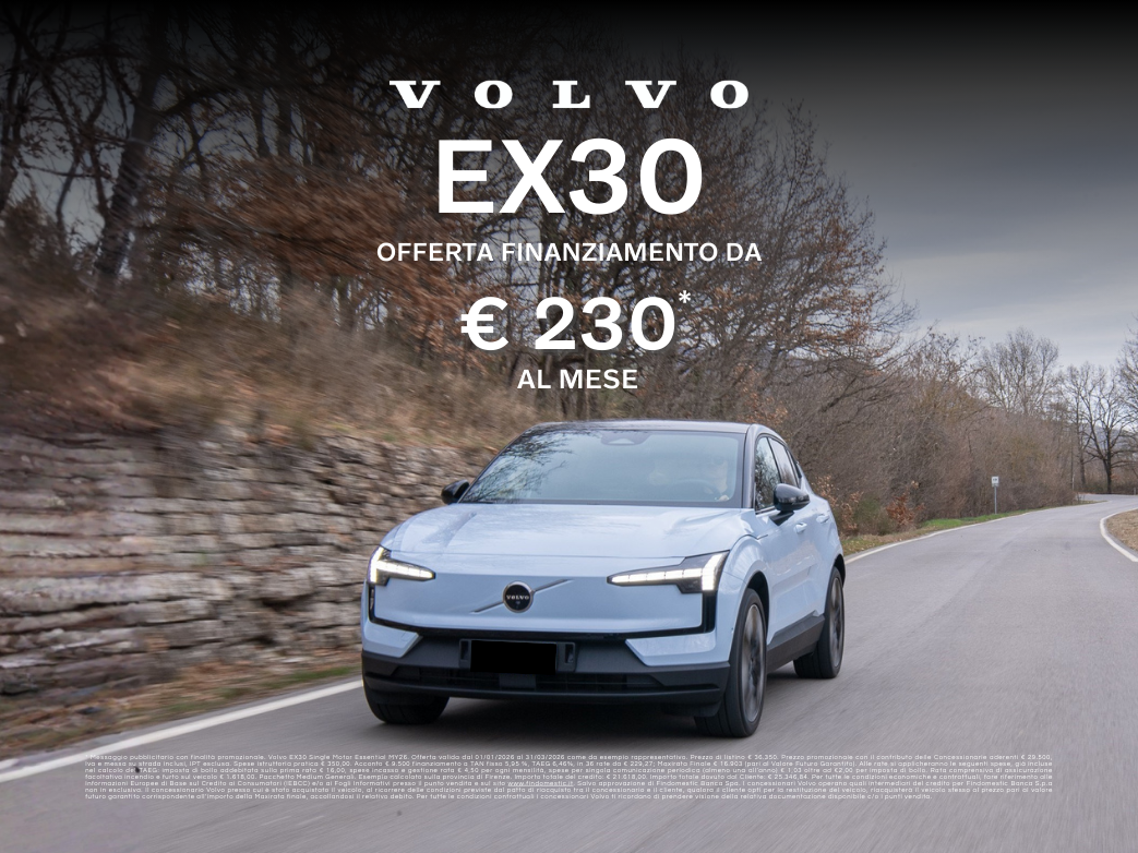 * Messaggio pubblicitario con finalità promozionale. Volvo EX30 Single Motor Essential MY26. Offerta valida dal 01/01/2026 al 31/03/2026 come da esempio rappresentativo. Prezzo di listino € 36.350. Prezzo promozionale con il contributo delle Concessionarie aderenti € 29.500, Iva e messa su strada inclusi, IPT esclusa. Spese istruttoria pratica € 350,00. Acconto € 9.500 finanziamento a TAN fisso 5,95 %, TAEG 6,46%, in 36 rate da € 229,27; Maxirata Finale € 16.903 (pari al Valore Futuro Garantito). Alle rate si applicheranno le seguenti spese, già incluse nel calcolo del TAEG: imposta di bollo addebitata sulla prima rata € 16,00, spese incasso e gestione rata € 4,50 per ogni mensilità, spese per singola comunicazione periodica (almeno una all’anno) € 1,03 oltre ad €2,00 per imposta di bollo. Rata comprensiva di assicurazione facoltativa incendio e furto sul veicolo € 1.618,00. Pacchetto Medium Generali. Esempio calcolato sulla provincia di Firenze. Importo totale del credito: € 21.618,00. Importo totale dovuto dal Cliente: € 25.346,84. Per tutte le condizioni economiche e contrattuali, fare riferimento alle Informazioni Europee di Base sul Credito ai Consumatori (IEBCC) e/o ai Fogli Informativi presso il punto vendita e sul sito www.findomestic.it. Salvo approvazione di Findomestic Banca Spa. I concessionari Volvo operano quali intermediari del credito per Findomestic Banca S.p.a non in esclusiva. Il concessionario Volvo presso cui è stato acquistato il veicolo, al ricorrere delle condizioni previste dal patto di riacquisto tra il concessionario e il cliente, qualora il cliente opti per la restituzione del veicolo, riacquisterà il veicolo stesso al prezzo pari al valore futuro garantito corrispondente all’importo della Maxirata finale, accollandosi il relativo debito. Per tutte le condizioni contrattuali i concessionari Volvo ti ricordano di prendere visione della relativa documentazione disponibile c/o i punti vendita.